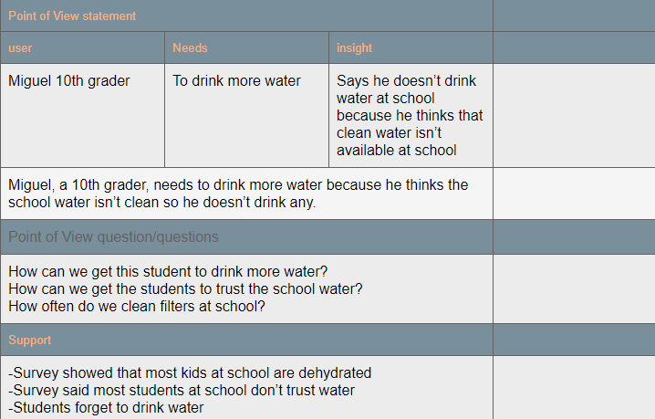 Miguel is the best example because he feels that the water at school isn’t clean which is what we heard from majority of the students. he doesn’t drink water despite being thirsty at school all because the water is unclean which narrows down our problem.